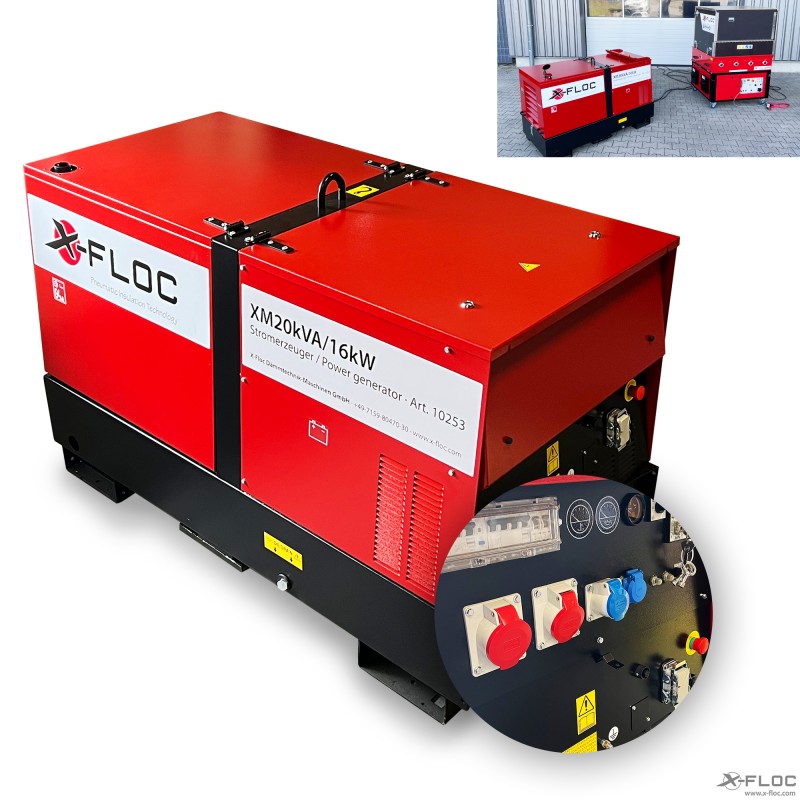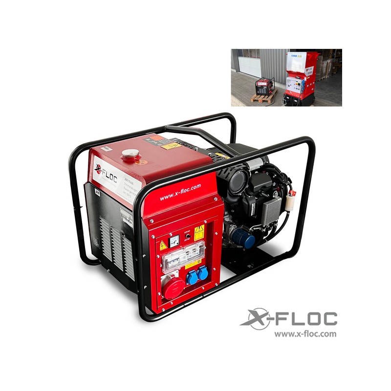 Power generator for operating an X-Floc insulation blow-in machine and suitable machines and consumers.